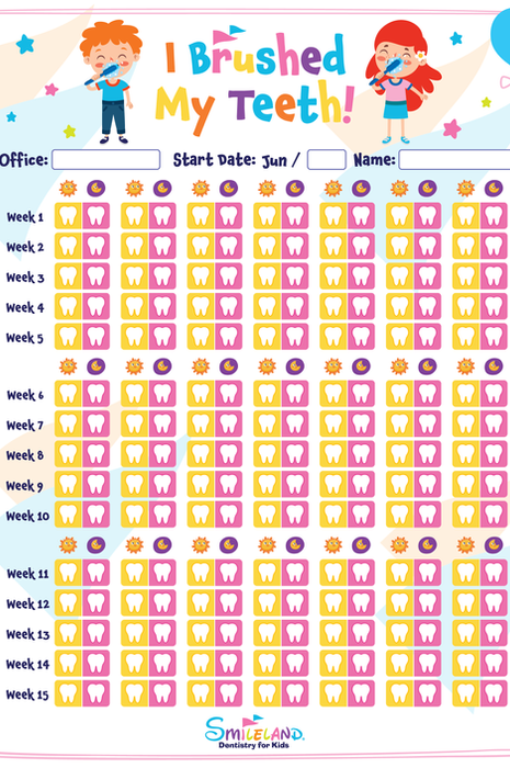 Brushing teeth twice a day is an essential part of maintaining good oral health. Tracking brushing habits can help maintain consistency and ensure teeth stay clean and healthy. Use this chart to mark off each brushing session in the morning and evening. Remember, healthy teeth lead to a bright smile! Download the form by clicking the button below. Once the form is printed and filled out for three months, bring it to any of our offices to receive 150 Smilerewards points.